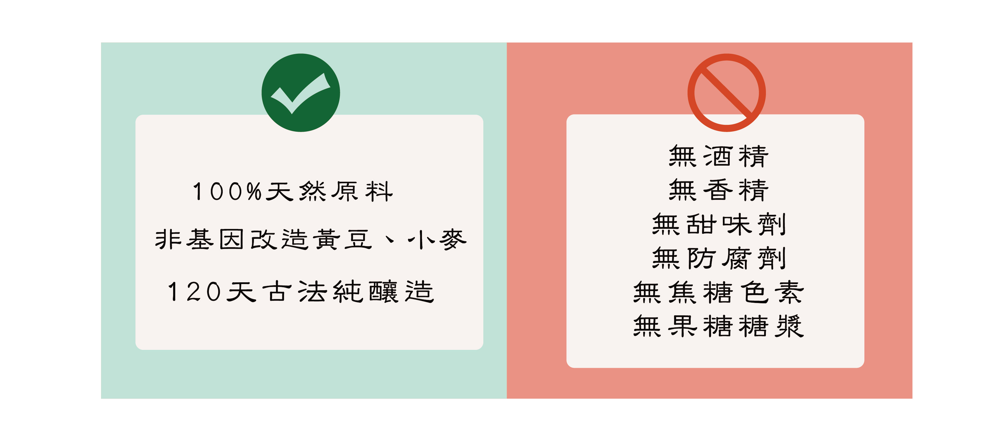 採用非基因改造的黃豆與小麥,以古傳統120天的大甕發酵並以無添加交互劑的風味形式,適用於煎、煮、炒、炸、沾、鹵等烹飪調味料