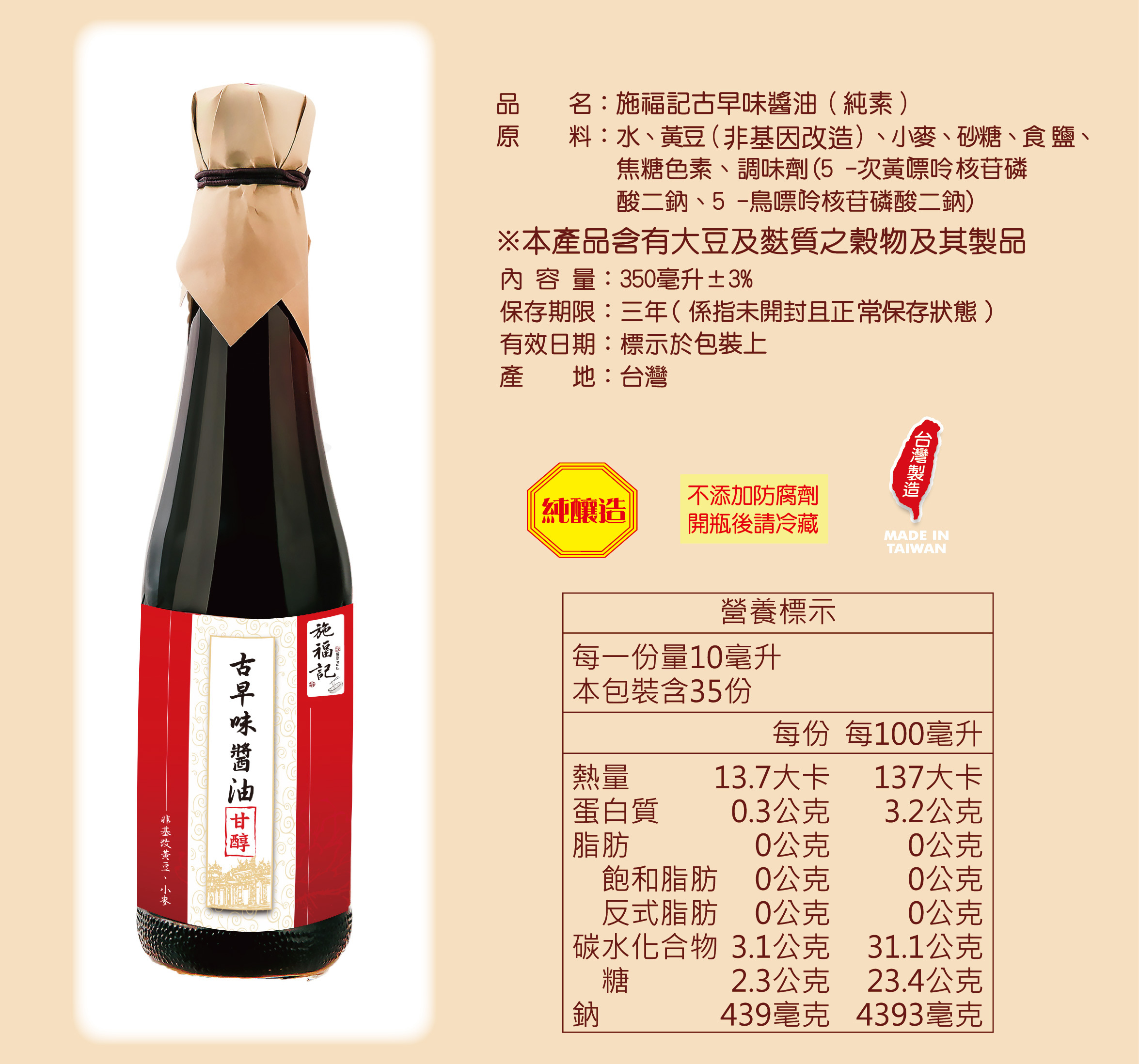 福施記古醬油採用優質的黃豆含有優質的蛋白質溫和不搶食材風味具有獨特的香氣與顏值,作為調味料時食材本身更美味增色三分